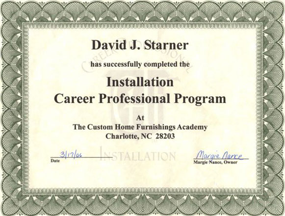 This certificate indicates that David Starner has successfully completed the Installation Career Professional Program.